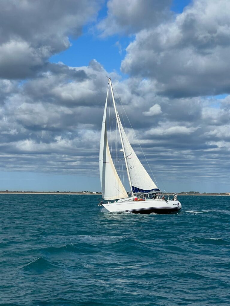 We purchased her in June of 2022 in Florida, moving her to Brunswick, Georgia for her fitting out. She required an extensive refit prior to setting sail on our circumnavigation. The hull had failing gel coat, necessitating complete removal of the old gel coat and application of a new barrier coat and CopperCoat antifouling. We also had to remove the rudder to replace the rotten core and the corroded rudder flange. Over the course of 8 months, we replaced every system except for the rig: plumbing, faucets, toilets, fuel tanks, holding tank, electrical components, powerplant, batteries, windlass and ground tackle, electronics, navigational gear, and emergency gear. We also had to replace a rotted structural bulkhead and remove and reseal the portlights and hatches. We added a dodger and replaced the bimini, as well as adding a solar array. It was a grueling time, as we were living on the boat while we were refitting, but we have been rewarded with a sound, fast, weatherly boat. She has safely taken us over 10,000 nautical miles so far!