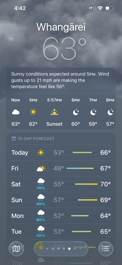 We are officially in Fall here and the weather is a bit crazy. New Zealand fall runs from March to May and so far it seems very rainy and very windy. And it changes by the minute – literally. Daytime temps so far seem to be a high of 65 with lows overnight down to around 50. We do not have heat on the boat but do have a portable heater that we use in the morning to warm things up. Fortunately, being a small space it warms up pretty quickly. Unfortunately, we can only use that at the marina so once we leave here, we will need to bundle up to stay warm until we hit the warmer weather as we head to our next location. And that location- drumroll please, is Fiji, via Minerva Reef!
